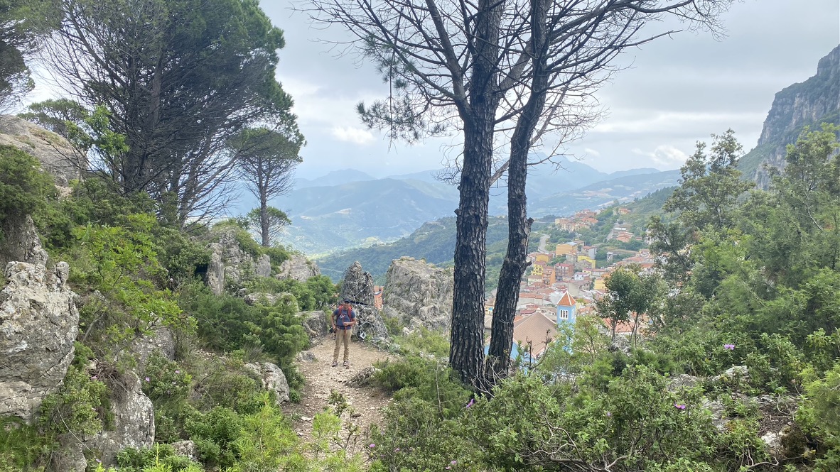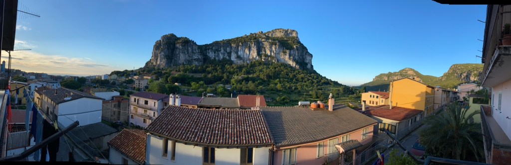 Our house is a comfortable 3 bedroom apartment with a glorious view of the one main crags, Torre de Venti and the Mediterranean off to far left. Right underneath the crag is the main plaza of Piazza Barigau, with a mini football pitch and playground next to the Piazza. Dogs, pigs, sheep and goat bells, and the occasional braying donkey provide a near constant but distant drone during the day. They do quiet down at night time. Church bells remind us of the time, with two strikes every half hour.